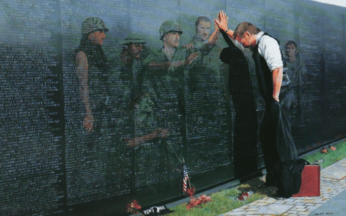 A man leans against a black, marble wall standing tall above him. White engraved lettering covers the entire wall running off the frame of the picture. The names engraved on this wall are those who were lost in the war. Seen in this image is an older man leaning forward with his arm extended, and head bowed down. Although you cannot see his facial expression, the viewer knows he is sad. There is a red suitcase resting on the ground next to him and his black suit jacket hangs over his suitcase lying on the brick pathway in front of the wall. There are a group of young soldiers in uniform casted as a shadow on the wall, facing towards the man. Starring at him, their arms are extended towards him and one of the soldiers has his hand mirrored against the older man’s hand. This image is of the Vietnam Memorial Wall. Statistics about this wall are that 58,267 names are engraved on this polished black wall, including those added in 2010 (Wilson). Those who have passed away most recently, are shown towards the end of the wall. The souls that were taken are alphabetized and the date they passed away is included. It has been 62 years since the first casualty and first engraving was made. The first known casualty was Richard B. Fitzgibbon, of North Weymouth, Massachusetts who was listed by the U.S. Department of Defense as having been killed on June 8, 1956 (Wilson). His name is listed on the Wall with that of his son, Marine Corps Lance Cpl. Richard B. Fitzgibbon III, who was killed on Sept. 7, 1965 (Wilson) There are three sets of fathers and sons on the Wall. The largest age group, 33,103 were 18 years old. One soldier, PFC Dan Bullock was 15 years old (Wilson). 997 soldiers were killed on their first day in Vietnam (Wilson). 1,448 soldiers were killed on their last day in Vietnam (Wilson). 31 sets of brothers are on the Wall (Wilson). Most of us see these large numbers and don’t understand the impact. The families and loved ones of the military members that did not survive, we treat with greater reverence and tend to sympathize more easily. Meanwhile, the survivors suffer endless pain and live with sacrifices for the rest of their lives. The cultural ideology of taking their service for granted is prevalent in our society. There is a mental health stigma that impacts our veterans and the caretakers of veterans are silently suffering every day.